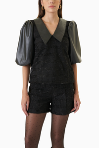 Trendy and Classic exquisite tweed co-ord set with faux leather trims, Pair it with knee high boots for that event ready ensemble.