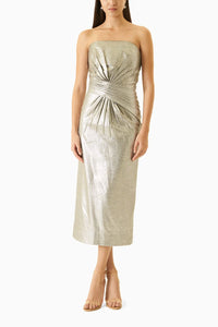 A glistening metallic dress that is effortlessly chic. The tube design with the midi length adds a charming sophistication to the whole look.