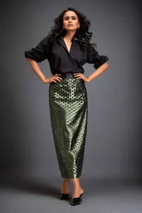 Featuring the Metallic Green Skirt With Layers from Deepika Aroras Metallic collection, this double-layered statement piece showcases intricate geometric cutout detailing over a structured silhouette. Designed with an inner skirt for comfort and form, it blends 100% Cotton, Vegan Leather, and Ponte Roma to deliver bold sophistication with a true-to-size fit.