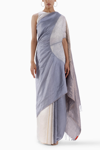 Featuring handwoven silk saree with a shibori sleeve detail and metallic pallav, dyed in a grey ombre. It comes with an unstitched ivory silk blouse piece.