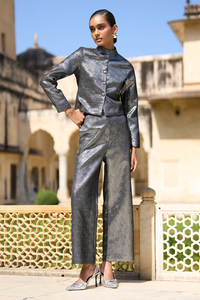 Structured band collar shirt with dramatic hammered silver button down front. Textured dark silver fabric. Full sleeves. Paired with matching straight pants in textured dark silver metallic fabric. Pockets in the sides, hook/eye and zip closure in the front.