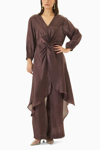 This burgundy metallic twist set features a striking long top, combining sleek style with a touch of glamour. Perfect for making a statement, it offers both elegance and modern flair for any occasion.