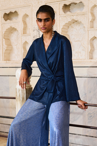 Tailored wrap style shirt in a shimmering, drapey metallic textural knit fabric. Blazer inspired notch collar, full sleeves, and an adjustable self-fabric tie belt detail.
