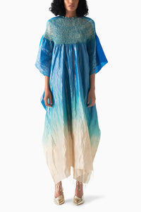 Featuring a free-size striped metallic silk ombre kaftan with our signature shibori neckline, dyed in blue