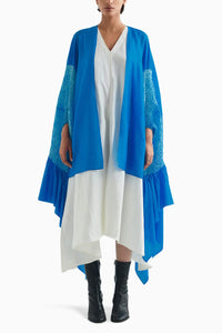 Introducing our free-size silk cape, designed with our signature shibori sleeves dyed in vibrant methyl blue. This elegant cape pairs the luxurious feel of silk with the striking artistry of shibori-dyed sleeves, creating a captivating contrast. The bold methyl blue adds a dynamic pop of color, while the flowing design ensures a versatile and flattering fit for any occasion. Perfect for enhancing both formal and casual outfits, this cape combines sophistication with a touch of contemporary flair.