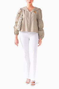 Elevate your style with the Mew Ecru Cotton Top paired with Pearl Denim White Flared Pants. This charming short top features a concealed placket and statement balloon sleeves, adorned with delightful crochet flowers on the left for a whimsical touch. Designed for a loose fit, it perfectly complements the full-length flared pants crafted from stretchable denim, ensuring both comfort and style. The pants include a back elasticated waistband and practical side pockets, making this ensemble ideal for any occasion, effortlessly blending elegance with ease.
