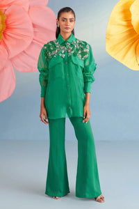 A rich Jade Green hue brings the Mia Cord Set to life — a graceful 3-piece ensemble featuring a flowy shirt, sleek inner, and tailored pants. Crafted in luxurious silk organza and crepe, its silhouette is elevated with delicate dori work, luminous pearls, and intricate 3D floral embroidery. This set beautifully captures the romance of the English era and Parisian elegance — perfect for evening wear and formal occasions.