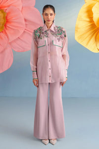 Breezy and elegant in dreamy lilac, the Mia Cord Set is a refined 3-piece ensemble including a fluid shirt, inner layer, and tailored pants. Crafted from pure silk organza and crepe, it’s adorned with delicate dori work, soft pearls, and romantic 3D floral embroidery. This set beautifully captures the romance of the English era and Parisian elegance — perfect for evening wear and formal occasions.