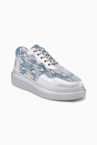 We borrowed some magic from the Magic City and added it to our Miami Palms classic sneakers. Yes, we can’t get our eyes off this pair either. Inspired by the blues surrounding Miami Beach, the palms lining it, and the Art Deco infusing it with a distinctive style, this silhouette carries Anaar’s love for all things glitzy. White and silver cutdana work with rainbow sequins is skilfully embroidered on denim, giving this pair its luxurious yet leisurely look. The cushioned sole supports you for hours on end while also adding abundant sparkle to your celebratory ensemble. Do you want to dance all night? We’ve got you! You want to sparkle all night? We’ve got you! The artisans of Anaar take 15 hours to carefully construct this pair.
