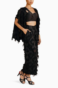 Featuring Mid Night Magic Co-ord Set by Auruhfy from Advaya Collection. A three-piece co-ord set adorning hand draped bustier in silk satin, cape, and pants in textured fringe detailed fabric. Discover the harmony of design in this Midnight Magic Co-ord.