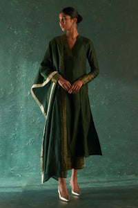 You can never go wrong with this classic chanderi Straight Kurta with a contrasting collar band, long sleeves that highlights a Stripe detail. Paired with Striped tissue palazzos and a chanderi dupatta with striped contrasting borders. Pick this for a classy look even for a formal winter event.