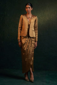 Must Have is this Gold tissue drape dress, simple yet chique that makes the heads turn while you walk like a diva in gold. The dress comes with a contemporary Gold tissue blazer that adds up your glam quotient. The simple sophistication of this dress will give it an enduring grace in your wardrobe. This dress is perfect for a cocktail or any other formal event.