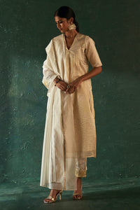Elegant tissue striped Kurta set with beautiful crinkled gota on front and back yoke paired with pants with gota on hem is styled with gota detailed chanderi dupatta. This beautiful cream gold ensemble can be worn for any of your formal and festive events.