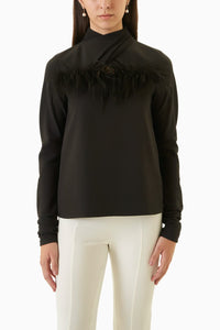 The Talia top is a statement top made for a magical evening. It features ostrich feather detailing at the neckline, draped high neckline and long draped sleeves.