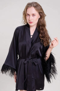 Indulge in elegance with this sleek black satin robe, featuring premium feather detail at the sleeve for a glamorous touch. Crafted from luxurious satin, this short robe offers a chic yet comfortable fit, perfect for lounging or adding flair to your nightwear. This robe flatters every body type while the satin tie belt ensures a customizable fit combining comfort and sophistication in one stunning piece. Finished with our special Mysthelle branded hardware & made ethically in our atelier.