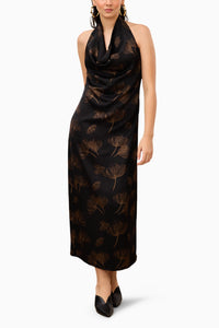 Printed satin midi dress with halter neckline and soft cowl drape .