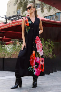Make a bold statement with the Midnight Blossom Wrap Dress. This stunning piece features a sleek black base, accentuated by vibrant oversized floral prints that cascade down one side, adding a touch of dramatic elegance. The wrap silhouette flatters your figure while the deep V-neckline and flowing design create an effortlessly chic look. Perfect for a night out or a stylish day event, this dress pairs beautifully with your favorite heels or boots, ensuring you stand out with a perfect blend of sophistication and flair.