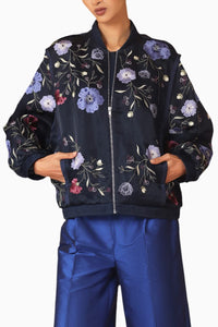 A timeless Shriya Som's bomber jacket from the Chrysalis Collection, crafted in sheer organza and adorned with exquisite floral embroidery, blending elegance with contemporary charm.