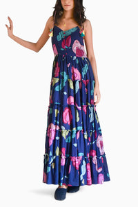 Make a statement at summer events with the floor-sweeping elegance of our Midnight Blue Dress crafted in fine mulmul fabric. This statuesque maxi dress was refreshed in Persian blue with multiple tiers in the dress and has foliage print all over. It features handcrafted buttons on the bodice, side pockets, and criss-cross strappy back. It is the perfect choice for coastal side and resort parties. ÂÂ