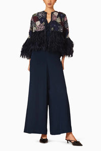 Presenting Shriya Som's embroidered feather jacket from the Chrysalis Collection, crafted in a tulle base and adorned with shimmering crystals. The design is elevated with luxurious ostrich feather accents at the hem and sleeves. Paired with a premium lachka base jumpsuit featuring a ruched bodice and intricate gitch embroidery, this ensemble exudes contemporary glamour.