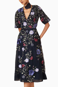 Presenting Shriya Som's A-line flare dress from the Chrysalis Collection, crafted in a tulle base adorned with soft, elegant floral embroideries. Enhanced with intricate 3D flower detailing, it exudes grace and charm.