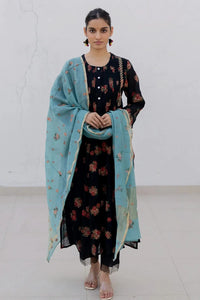 A pintuck-style relaxed-fit kurta in handwoven chanderi, featuring a scoop neckline, placket, and three-quarter sleeves. Adorned with hand block prints in natural dyes and accented with delicate zari hand embroidery on the kurta. Paired with cotton pants and our signature handwoven chanderi dupatta with zari weaving, showcasing hand block prints in natural dyes for an effortlessly elegant ensemble.