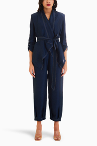 A symbol of refined elegance and timeless sophistication. Crafted from luxurious silk in a deep midnight blue hue, this jacket exudes understated luxury. Paired with spaghetti and pants, crafted from sumptuous silk in a deep midnight blue hue. The flowing silhouette and tailored design offer a flattering fit that is both chic and comfortable. Whether worn for a cocktail party or a chic daytime look, this set will elevate your style with effortless grace and confidence.