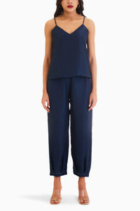 A captivating blend of luxury and allure. Crafted from luxurious silk in a deep midnight blue hue, this spaghetti top and pants. The flowing silhouette and tailored design offer a flattering fit that is both chic and comfortable. This set will elevate your style with effortless grace and confidence.