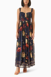 Fea turing the Midnight georgette ma xi dress by Miri Pret. The dress is cra fted in a na vy hue a nd cut in delica te viscose georgette. It ha s a ma xi length, fea turing a well-deta iled bust a nd a flowy skirt. The dress is highlighted with bea utiful borders on the stra ps a s well a s the bottom. The dress ha s a soft lining.