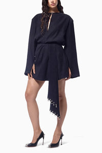 This bold black set makes a striking statement with its wide-shoulder top, featuring a subtle plunge neckline for a touch of allure. The draped skirt flows elegantly, enhanced with hand-embellished metal septums that add a daring, edgy detail. Crafted in classic black, this set is a perfect blend of sophistication and modern design.