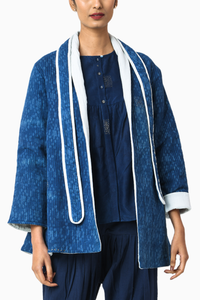 Introducing the Midnight Quilted Jacket by Jayati Goenka. This indigo-colored cotton quilted jacket is hand-block printed with natural dyes, featuring solid natural dyed cotton linen lining for skin-soft comfort. Detailed with signature handwork in golden thread, it includes a quilted belt for effortless styling.