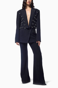 This avant-garde black suit features a striking hand-embellished cropped jacket with metal septums, adding an edgy, artistic flair. Paired with skouser-style wide-legged pants, the ensemble offers a bold, contemporary silhouette that blends modern sophistication with experimental design.