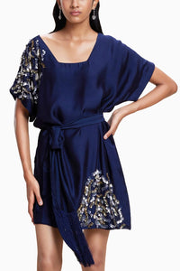 The Midnight Blue cotton silk tie-up dress, with its semi-fitted silhouette and intricate detailing, is a must-have for any wardrobe. Its timeless color and versatile design ensure effortless style and sophistication for any occasion.