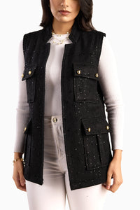A sleeveless black tweed vest jacket with a structured silhouette, subtle bead embellishments, four flap pockets, and gold-tone buttons. Its detachable belt shapes the waist, while the open-front design makes it a versatile, sophisticated layer for chic, semi-formal, or office looks.