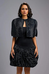 A strapless black knee-length dress with a voluminous ruched shimmer embroidered bottom that adds texture and drama. The elegant cape detail enhances the silhouette, making this piece perfect for standout evening occasions.