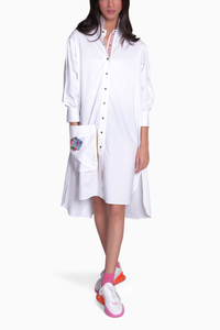 Featuring Mihoco White Dress by Chillosophy from Confetti Collection. This relaxed-fit midi shirt dress showcases a rounded, longer back and full front closure with brass buttons. It has oversized pleated shoulder sleeves, colorful cross weave detailing at the back, and a large front pocket with confetti accents.
