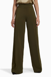 Featuring Military Green Stretch Suiting Wide-Leg Trousers by Refined Revolution. These high-waisted trousers, crafted from 90% polyester and 10% elastane, offer comfort and style. With a wide waistband and invisible side zip, they ensure a true-to-size fit.