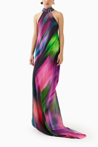The Milky Way Halter Dress crafted from Studio Rigu's stunning vegan silk fabrication has Embroidered Swarovski Collar. Made in three in our stunning Han painted galaxy printed, this is a trend setting piece. Featuring halter sleeves, this piece is versatile and easy to wear. It is floor length and has an easy to wear fit. Pair it with heels for an elegant look.