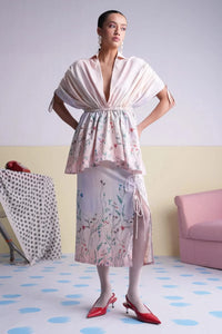 Featuring Millie Georgette Ruched Top with Skirt by Mero's DOT collection. This graceful co-ord set includes a floral printed ombre peplum top with a cinched waist, paired with a matching skirt featuring delicate tie-string detailing. Crafted in soft georgette, it offers a romantic and fluid silhouette.
