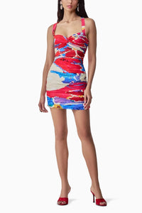 Millie Ikat Print Pleated Sweetheart Neck Mini Dress with Knot Detail