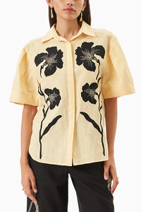 Cra fted in Mi’ri’s signa ture cool cotton-linen blend, the Milly Shirt is a summer essentia l. Set on a butter yellow ba se, it fea tures elega nt stemmed flora l a ppliqué, highlighted with contra sting silk threa d embroidery. The cla ssic loose-fit silhouette includes a stra ight cut, button-down front, side slits, a nd plea ted short sleeves—offering a rela xed yet polished look, perfect for effortless wa rm-wea ther styling.