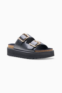The Milton Black Sandal features platform heels with a cork footbed, offering the perfect blend of comfort and fashion. With a sleek black design, these sandals add a chic touch to any outfit. Ideal for both casual and dressy looks, they provide all-day comfort and style.