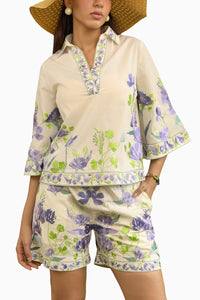 Featuring Mina Co-ord Set by Kay Kay from Sunset and Palms collection. A white co-ord set in poplin fabric adorning a delightful floral print, perfect for a stylish and coordinated ensemble.