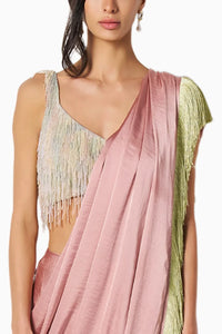 The Bead Fringe Blouse is a fun and stylish addition to your wardrobe. It is carefully hand-embroidered with colorful beads that create an ombre fringe effect. The blouse features a slightly rounded V-neck and a curved hem for a soft, flattering look on the body. It fastens on the side with a concealed zip and pairs perfectly with a sari or a skirt.
