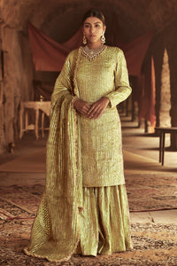 The Mint Benazir Garara Set features a silk chanderi kurta sharara set with lampi stripes highlighted with cutdana, teamed with a silk organza dupatta filled with lampi stripes and edged with fine kiran.