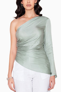 Featuring Bianca Top by Contemponari. Add a touch of sophistication to your wardrobe with this luxe asymmetrical top that combines an off-shoulder design on one side with a full sleeve on the other, creating a uniquely stylish silhouette. The smooth Modal Satin fabric not only accentuates the soft side pleats but also makes the midnight blue shade look richer.