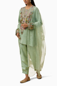 Featuring a mint chanderi kurta with an embroidered yoke paired with a jogger pant and a mukaish net dupatta.