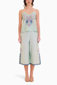 A delightful blend of whimsy and sophistication. Crafted from lightweight chanderi fabric in a serene mint hue, this spaghetti top and culottes feature intricate embroidery that embodies the essence of dreamy elegance. The wide-leg silhouette offers comfort and freedom of movement. Perfect for warm-weather outings or adding a touch of bohemian charm to your ensemble.