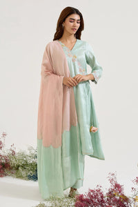 Graceful and festive, the Mint Floral Zari Tissue Angrakha Set features delicate embroidery, elegant cutwork, and narrow pants for a refined silhouette. Paired with a mint-hued Chanderi Dupatta, adorned with floral embroidery and a shimmering tissue panel, this ensemble blends tradition, elegance, and modern charm effortlessly.