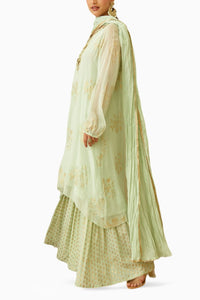 Featuring the Mint Foil Embroidered Sharara Set by Nikasha from their Kohinoor collection. This exquisite ensemble showcases a mint foil viscose georgette kurta adorned with dabka and sequins zardosi, paired with a stylish dhoti and crushed cotton dupatta.